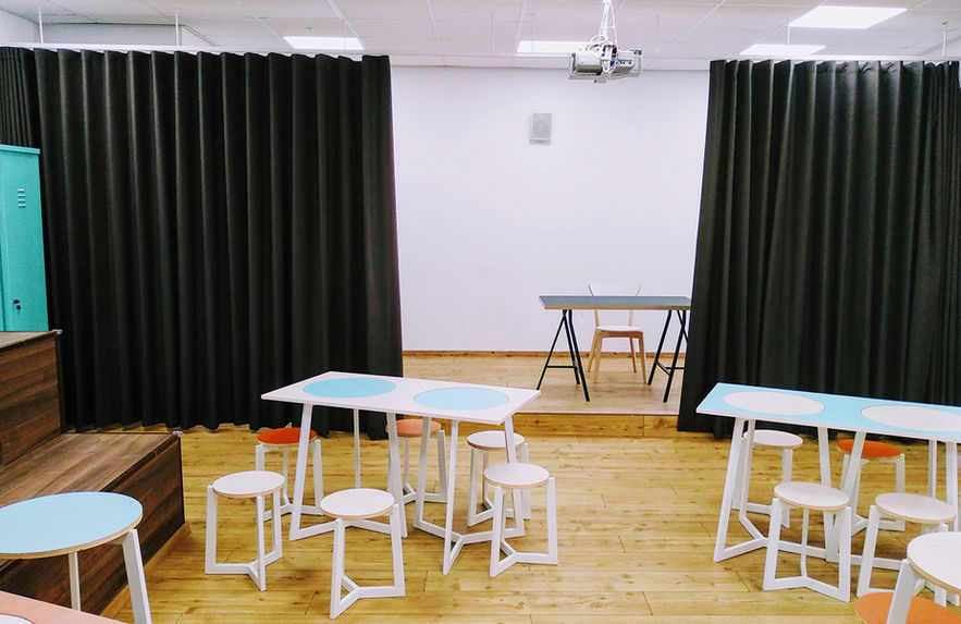 כדי לאפשר ריבוי שימושים, ייצרנו במיוחד שולחנות וכיסאות לחלל הכיתה המתפקדים כשולחן ושרפרף בודד בסגנון ״קפה תאטרון״ וגם יודעים להפוך לשולחן מרווח בתוספת פלטה עליונה. את הפלטות ניתן לאחסן במקום מיוחד מתחת לבמה.